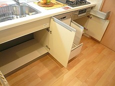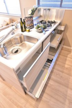 調理台の下にはスライドキャビネットと食器洗浄乾燥機。引き出しタイプのスライドキャビネットは出し入れがしやすく、ぎっしり詰めても中が確認出来るのがポイントです。憧れの食洗機!!寒くなるこれからの季節、食器洗いから解放されるなんて夢のよう。時間をかけてコーヒーを淹れてみたり・・・食後の時間が充実しそうです(*´▽`*)