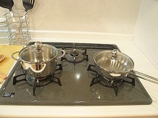 コンロは3口。タイマーや温度設定が可能な高機能タイプです。IHだけかと思ったらガスコンロでもこんな事が出来るようになっていたんですね^^;)開放感を損なわないよう、コンロ前の仕切りはガラス製。