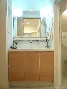 洗面台は身だしなみチェックに便利な三面鏡付き。上部に付いた照明のおかげで、鏡を見る時に影になることもありません。