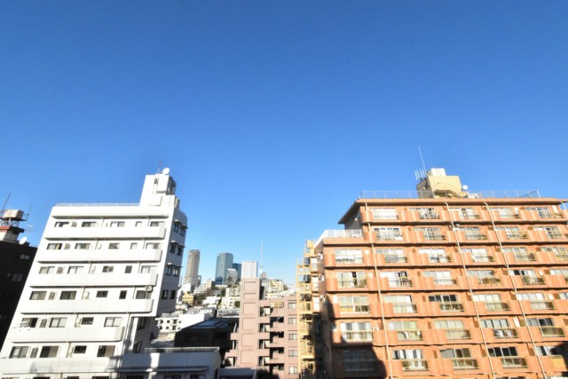 前には高いビルが並んでいますが、道幅の広さと10階という高さで圧迫感のない開放的な眺めになっています。遠くには渋谷のセルリアンタワーやスクランブルスクエアも見えますね。