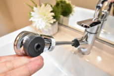 水栓はヘッドが伸ばせて、洗面ボウルを流したりしやすくなっています。