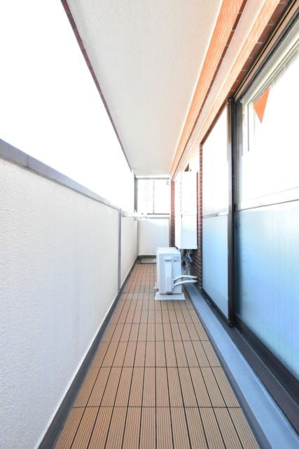 広さ7.28㎡、北東向き。二部屋にまたがる広いバルコニーです。床にはデッキパネルが敷かれていてとてもきれいですね。物干し金具も付いているのでお洗濯物も干せますよ。