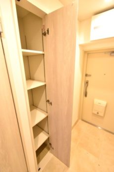 玄関入って左側にある収納です。棚の位置も調整可能なこちらの収納には、生活に必要なストック物や棚を外してかさばる掃除機などもスッポリ収まりそうです。