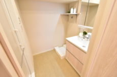 洗濯機置場と洗面化粧台はお隣同士。鏡の横には小物の保管に便利なキャビネットが設置されています。白で清潔感がありますね。