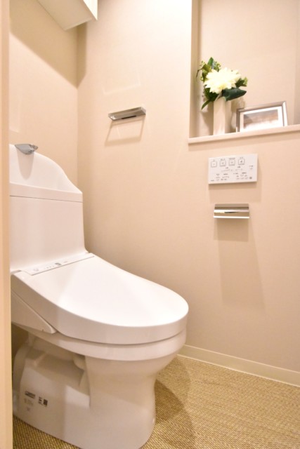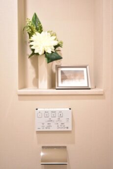 トイレットペーパーなどのストックに便利な吊戸棚が付いています。洗浄便座はTOTO製のウォシュレット。ニッチカウンターではインテリアを楽しんだりも出来ますし、スマホを持ち込む派の方には嬉しいスペースではないでしょうか(笑)今はお洒落な消臭剤もたくさん出ているので、それもいいですね。