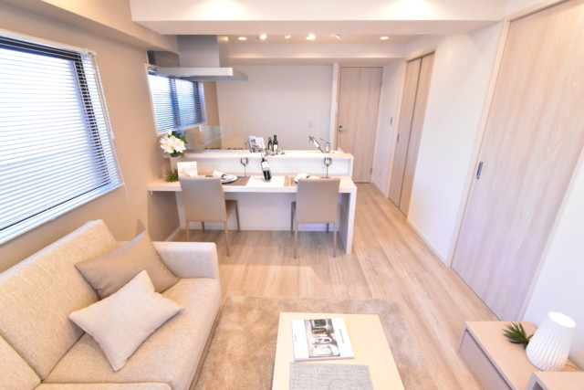 キッチンカウンターがダイニングテーブルを兼ねているようです。食事に重心をおいている方は、リビングとダイニングを兼ねた家具にするのもいいですね。モデルルーム家具は付いて来ませんので、自由に選ぶことが出来ますよ。