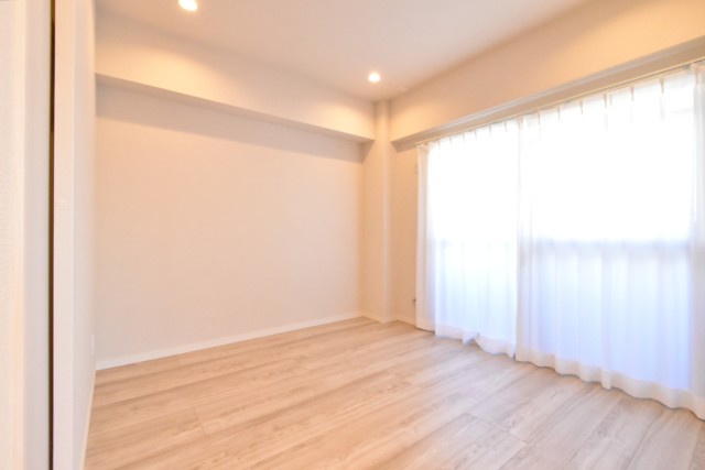 こちらは洋室。LDKと同じバルコニーに面した大きな窓のあるお部屋です。シンプルな色使いで、幅広く家具を合わせることが出来そうですね。