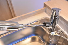水栓は浄水機能付きシャワー水栓。切替えるだけで気軽に美味しいお水を使う事が出来ます。ノズルが伸びてシンクを流したりにも便利ですよ。