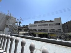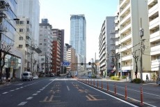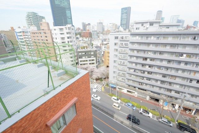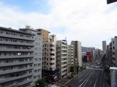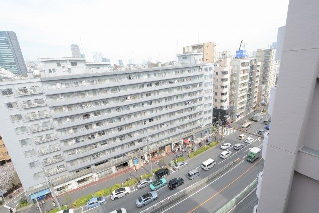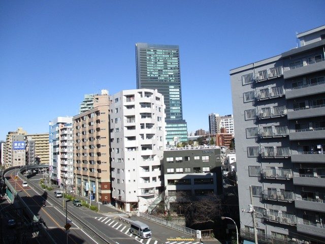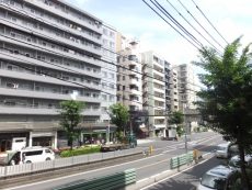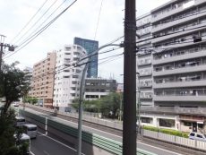 バルコニーの外はエントランス前の山手通り。通り沿いにマンションやビルが立ち並ぶ風景です。