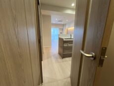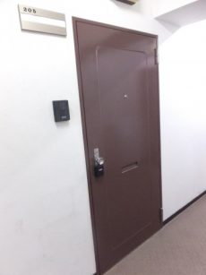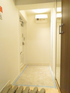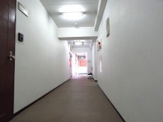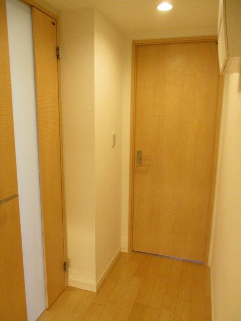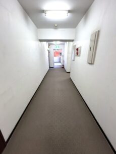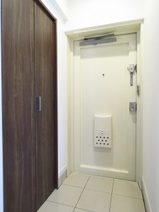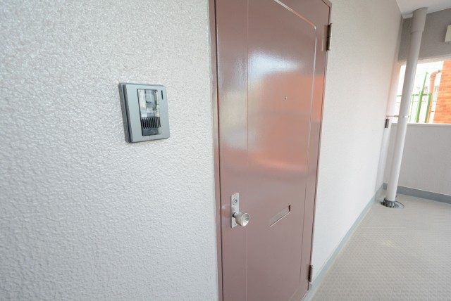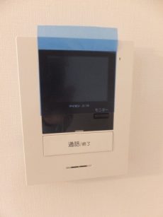 エレベーターを降りてお部屋へと向かいます。共用廊下は外廊下部分と内廊下部分がありますが、今回のお部屋は内廊下部分にありました。玄関脇のインターホンはカメラ付きで、室内のモニターから訪問者を確認できるので安心です。