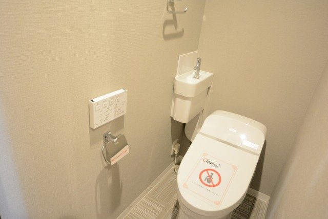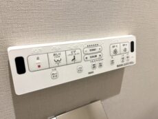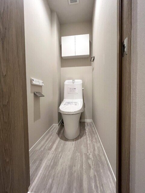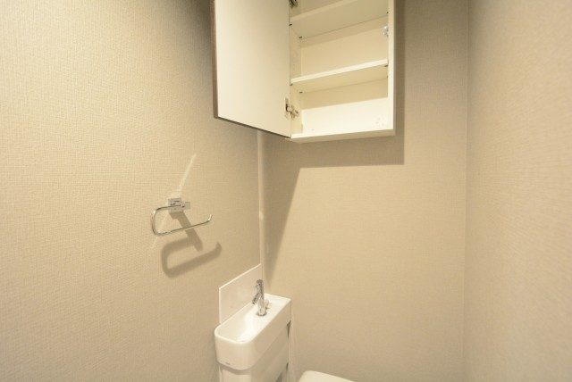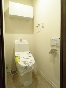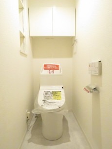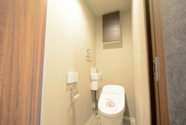 ウォシュレットと吊戸棚、物置棚がついています。ペーパーのストックなど見せたくない物は吊戸棚へ、おしゃれな芳香剤やちょっとしたインテリアなどは物置棚へと分けて置けるのがいいですね♪