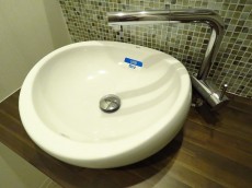 まあるいフォルムの洗面ボウルが印象的な洗面化粧台。鏡の上下のモザイクタイルもステキですね!横に物置棚もついています。