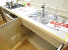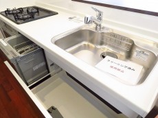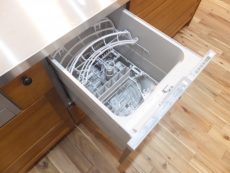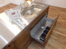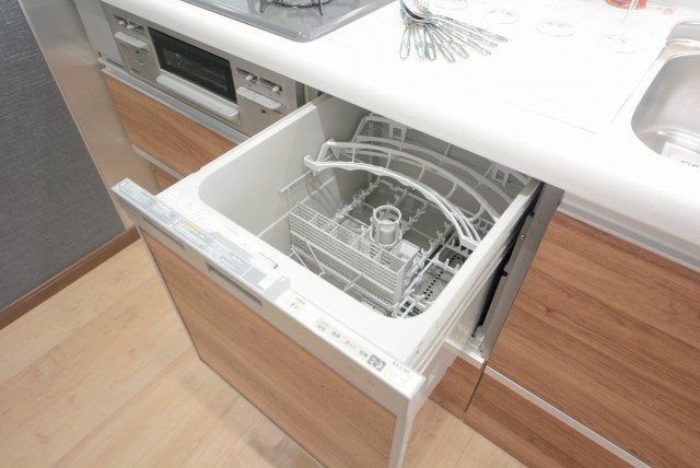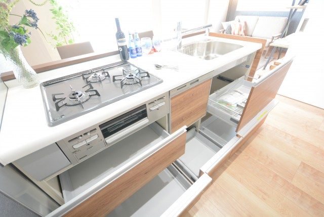 収納は出し入れのしやすいスライドキャビネット。ぎっしり詰めても中身のチェックがしやすいのも嬉しいですね。食器洗浄乾燥機が付いているので洗い物はお任せして食後はのんびり過ごしましょう!