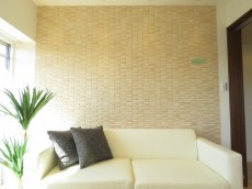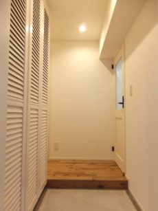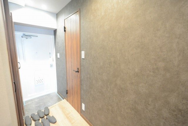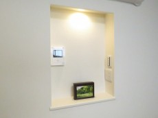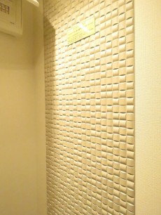 さっそく中へ。玄関扉をあけると正面の壁面には調湿・消臭などの効果があるエコカラットが設置されています。窓がなく換気がしずらいスペースだけに空気が快適に保てるのはうれしいですね。人感センサーがついているので照明も自動で点灯&消灯します。