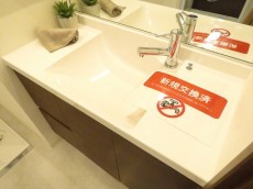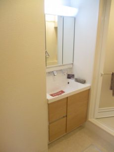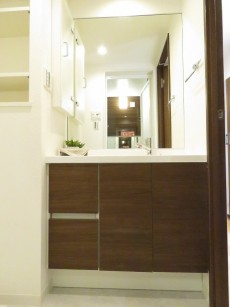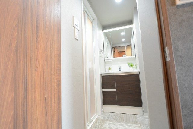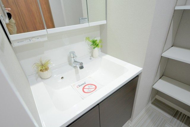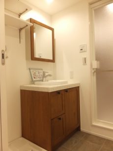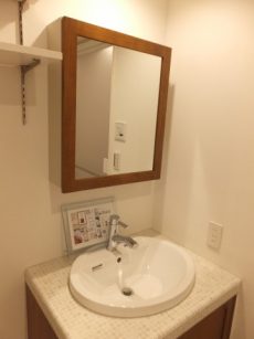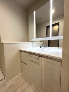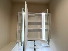 洗面化粧台は身だしなみを整えるのに便利な三面鏡付き。裏がキャビネットになっているので、洗面周りの細々したものもスッキリと片付けることができますよ。