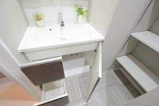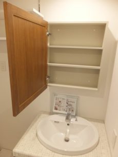洗面化粧台は引き出しの他、横の壁面にキャビネットもついています。