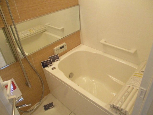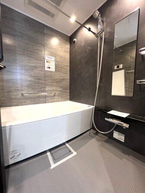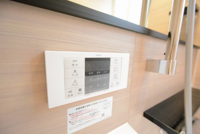 1416サイズの浴室は、ダークトーンに真っ白なバスタブが際立つ高級感のある雰囲気です。追い焚き機能や浴室換気乾燥機などの便利機能も完備。ボタンひとつでお風呂の準備ができるなんて、、、なんて便利な世の中になったんでしょう!