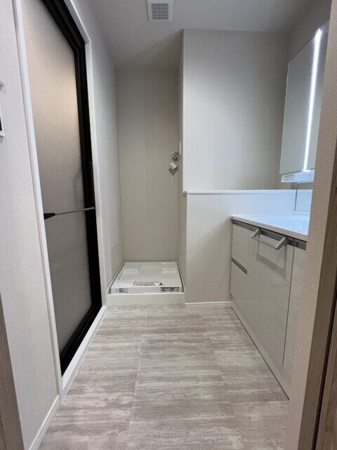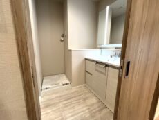 トイレのお隣に洗面室。洗面化粧台、洗濯機置場、バスルームがまとまっています。