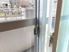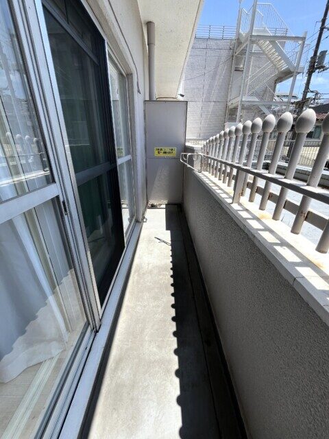 最後にLDK側のバルコニーに出てみます。ちょうど1人立てるくらいの幅でしょうか。少し狭い印象です。網戸は窓の内側に設置されています。