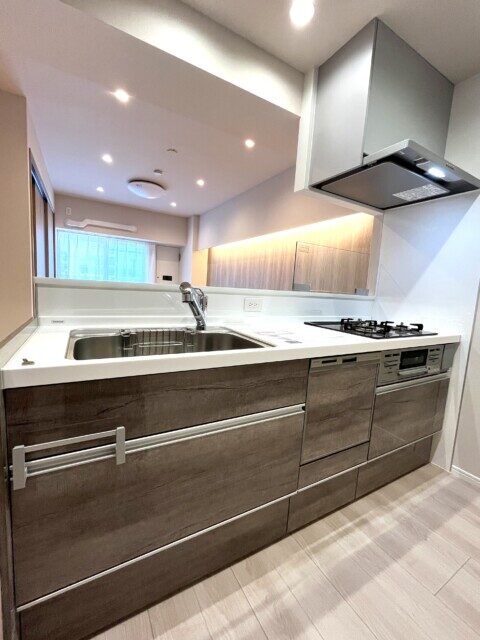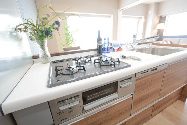 キッチンは浄水機能付き水栓、3口ガスコンロ、食洗機にグリル付きとスペック◎!真正面に窓があるのでお料理中の熱や匂いもスムーズに解消できます。