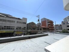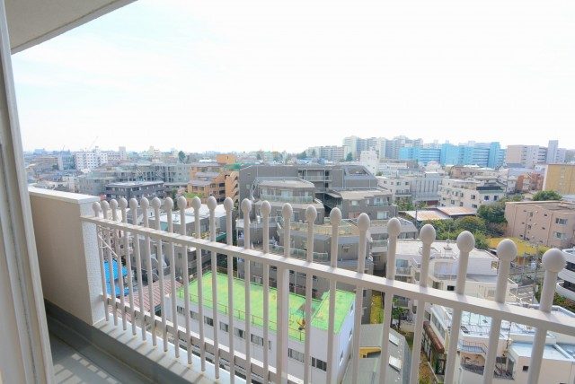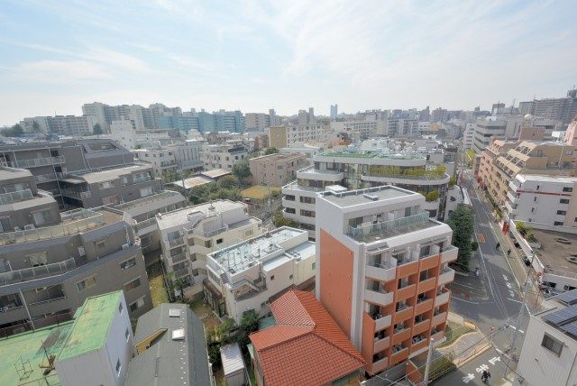 バルコニーの外は洋室側と同じ眺望。エントランス前の山手通り沿いにマンションやビルが立ち並ぶ風景です。