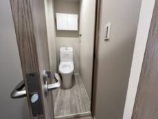 トイレはウォシュレット付き。ペーパーのストックや掃除用具の保管に便利な収納棚が設置されています。ちなみにトイレにも人感センサーがついているので扉をあけるとパッと電気がつきます。