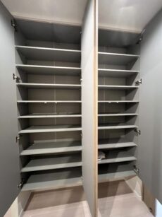 キッチンの横あたりには可動棚付きの収納スペースも設けられています。