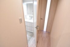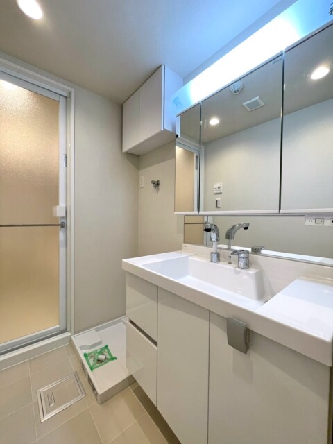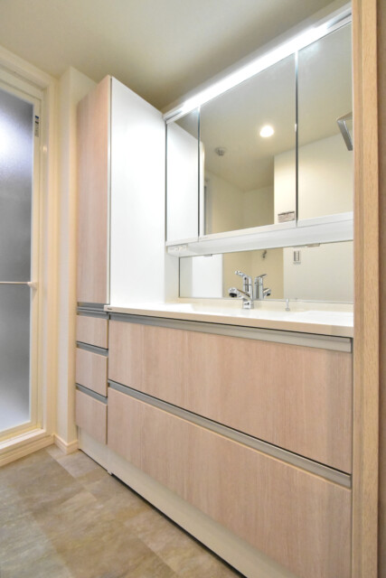 洗面台は身だしなみを整えるのに便利な三面鏡付。上部の照明で影が気になることもありません。ミラーキャビネットをはじめ、収納が豊富で散らかりがちな洗面周りもすっきりさせておくことが出来ますよ。