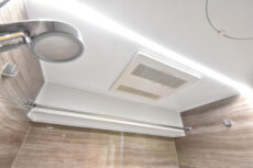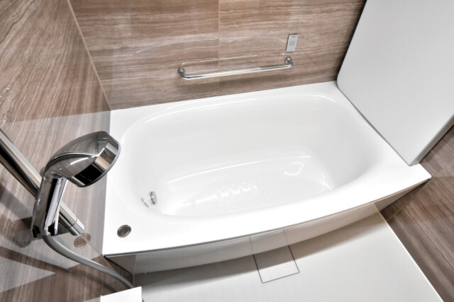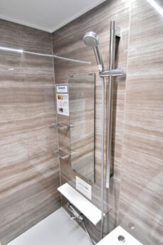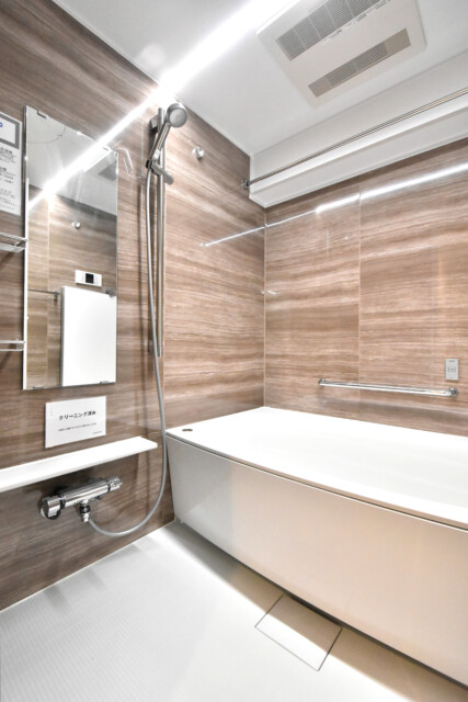浴室はブラウンの木目パネルを使用した1416サイズの寛ぎ空間。鏡面仕上げで高級感をだすとともに、お掃除の手間も軽減してくれています。
