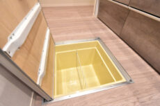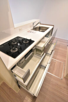 収納は調理台下のスライドキャビネットと床収納。スライドキャビネットは出し入れが楽で、ギッシリ詰めても中の確認がしやすい優れものです。床収納はマンションでは珍しいですね。1階ならではです。