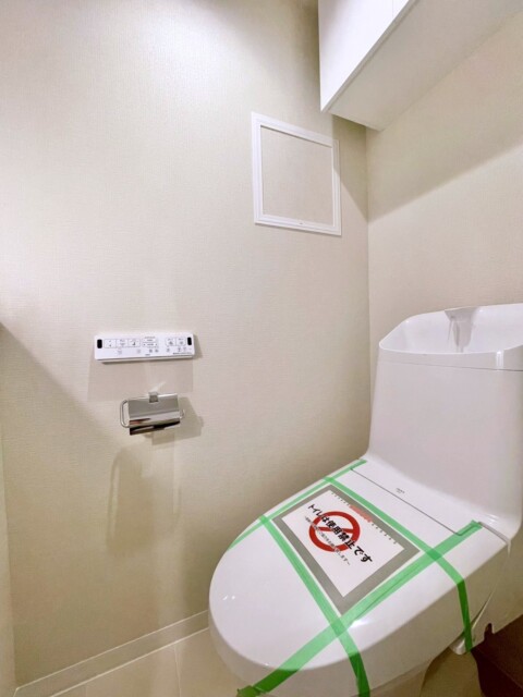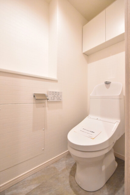 トイレは洗浄機能一体型。トイレットペーパーや掃除道具などの収納に便利な吊り戸棚も付いています。