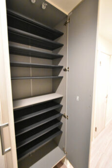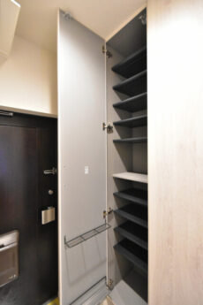 シューズボックスはトールタイプふたつで収納力抜群!棚が調整出来るので、ヒールやブーツなどでも収納可能ですよ。扉の外側には姿見、内側には傘立てが付いています。湿気が籠るとカビや臭いの原因になるので、傘や靴はきちんと乾いてからしまいましょう!