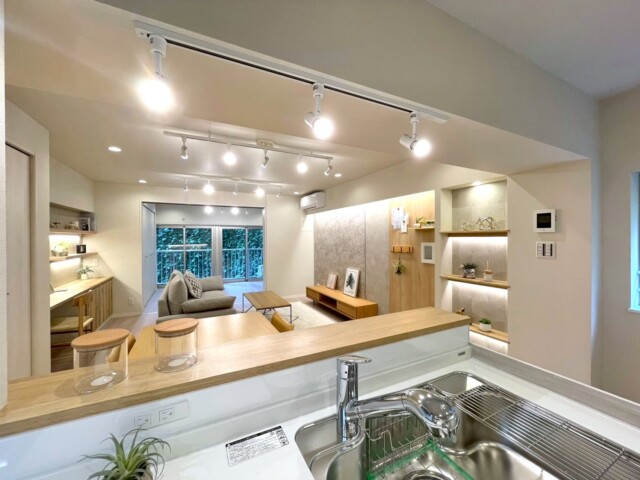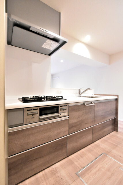 キッチンは人気のカウンタータイプ。開放感がありコミュニケーションが取りやすいのが人気の理由!収納棚付◎