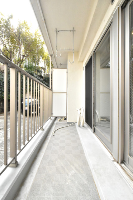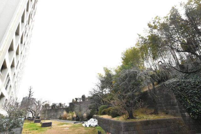 バルコニーのすぐ下は敷地内駐車場。その向こうには庭のようなスペースが広がっています。後で調べてみたところ、お隣の「松風園ハイツ」のお庭のようです。借り物ですが、まるで我が家の庭のようで得した気分ですね♬