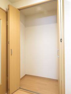 南向きバルコニーに面した明るいお部屋です。サイズは多少コンパクトですが、入口にデッドスペースを作らない引き戸を使っているので床面を無駄なく使うことができますよ。ベッドのサイズを決める際にはこれが意外と大きいんですよね。こちらのお部屋には収納がありませんが、もう一つの洋室にはクローゼットが付いています。