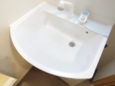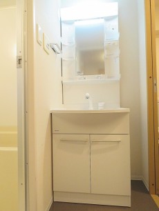 正面に洗面化粧台。白で清潔感たっぷりです。