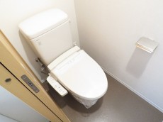 トイレはINAX製の洗浄機能付き。トイレットペーパーのストックや掃除道具を入れるのに便利な吊戸棚も付いています。