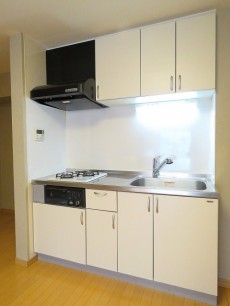 コンロは3口、グリルも付いています。グリルって魚を焼くイメージが強いと思いますが、他のお料理にもいろいろと使えるらしいですよ。ご興味のある方は是非調べてみて下さい。吊り戸棚が付いて収納もバッチリ♬