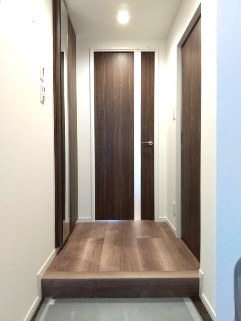 玄関から続く短い廊下は少し濃いめの木目を使ったシックな雰囲気。リノベーション物件ということでとても綺麗ですよ。シューズボックスは廊下部分に設置されています。玄関内にあることが多いんですが、脱いだ靴を入れるんだから裸足で立てる部分にあった方が便利ですよね(^-^;