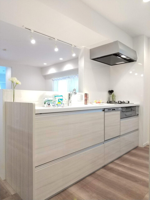 一口にカウンターキッチンと言っても、前面が全部オープンになった開放的なものから、パネルでカバーされた部分が多いものまで様々です。こちらはしっかりカバーされたタイプ。キッチンからの眺めを確保しながら、油跳ねなどでお部屋が汚れるのを防いだり、生活感のあるキッチンをリビングから目立たないようにしたりと、バランスのとれたキッチンです。システムキッチンは食器洗浄乾燥機や浄水機能一体型水栓など役立ち機能が充実!食器洗いから解放されて食後はのんびり過ごせますね♬