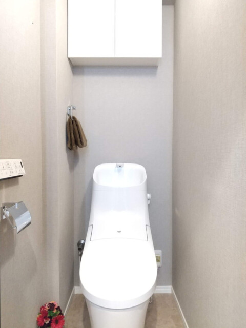 トイレは洗浄機能一体型。トイレットペーパーなどの収納に便利な吊り戸棚も付いています。