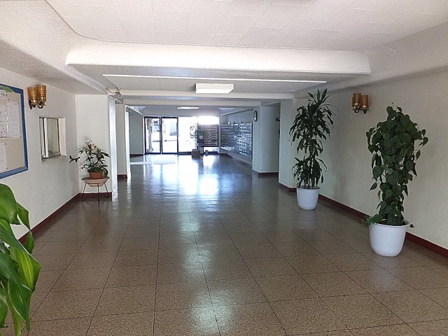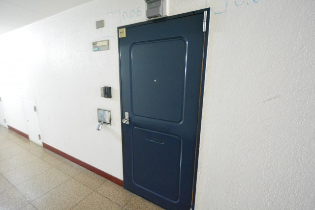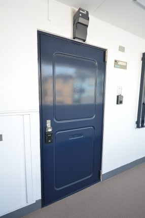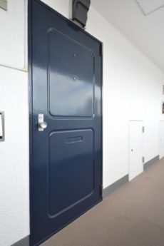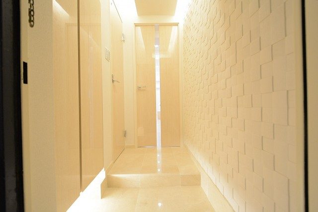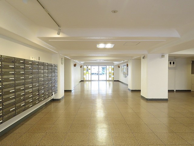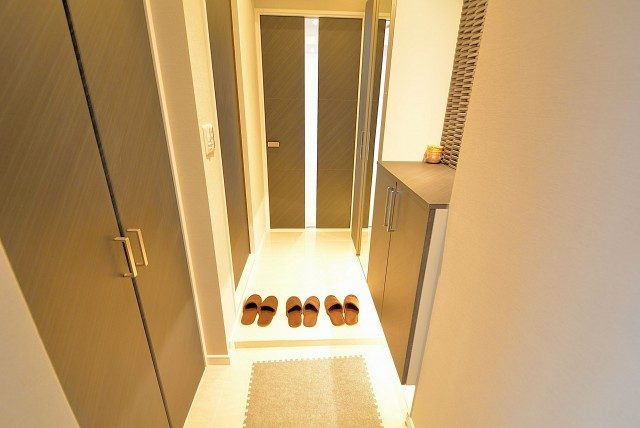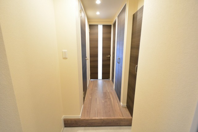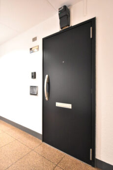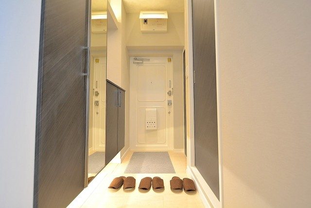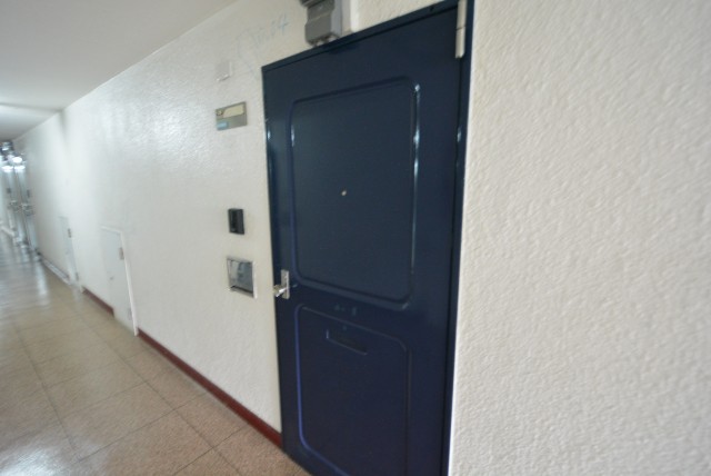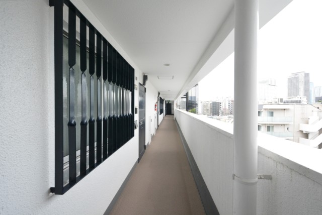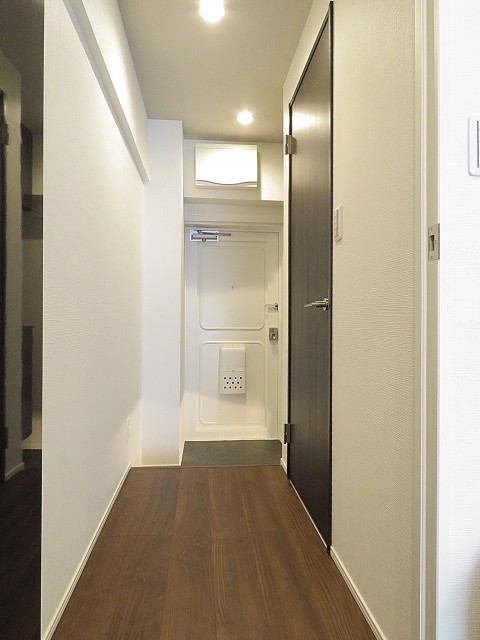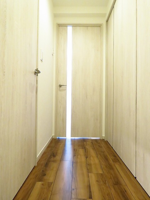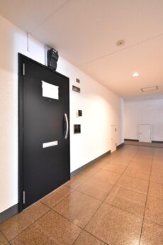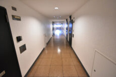 エレベーターで5階まで上がり共用廊下をお部屋へと向かいます。幅の広い内廊下はシ~ンとしていて外とは別世界のよう。雨風の影響もありませんし、プライバシーや防犯面でも優れています。