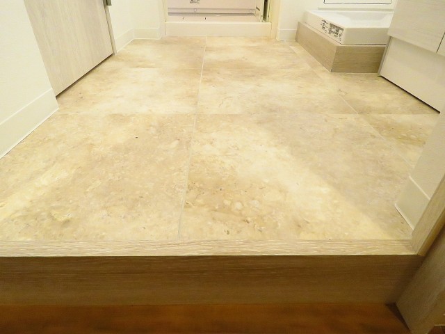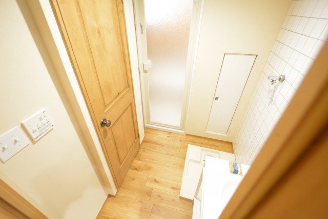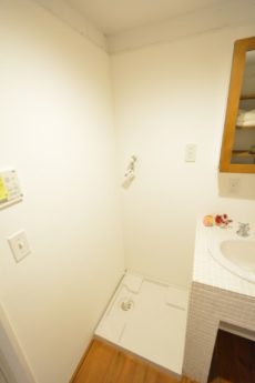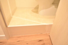 洗面室洗面室には洗面化粧台と洗濯機スペース、浴室がまとまっていて脱衣所を兼ねています。洗濯機スペースには棚が付いているので洗剤などのランドリー用品を置いておくことも出来ますよ。こちらも少し段差があるのでご注意を。