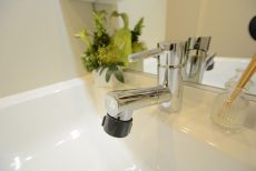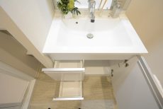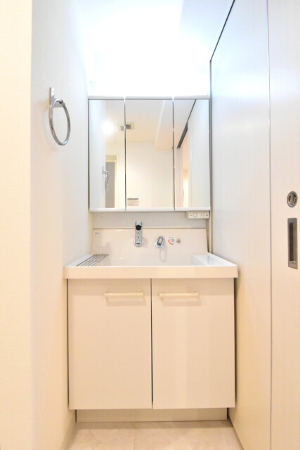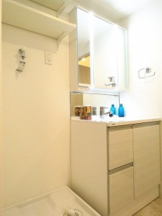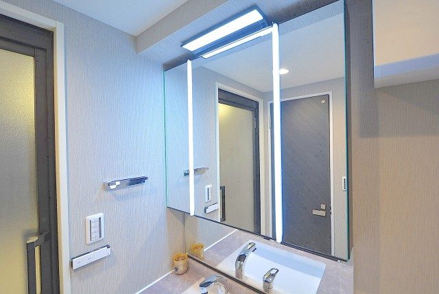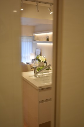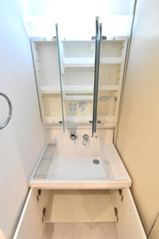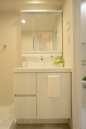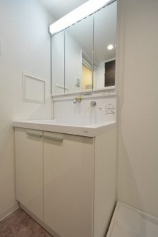 白一色で清潔感のある洗化粧台は身だしなみチェックに便利な三面鏡付。上部に照明が付いているので影になる心配もありません。