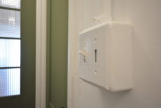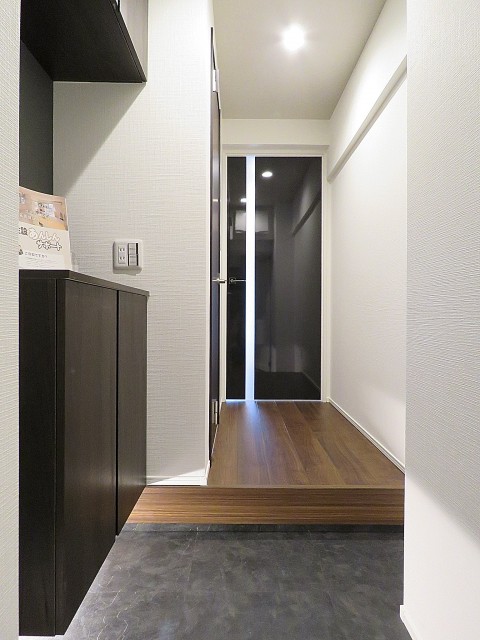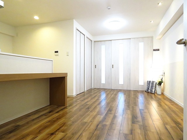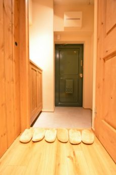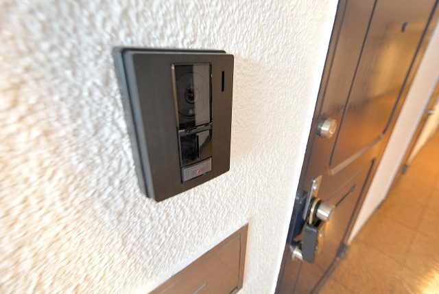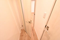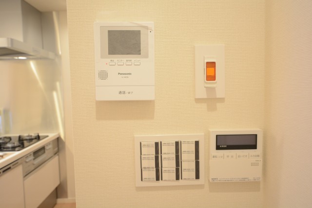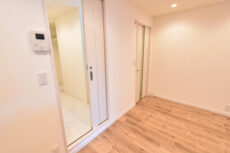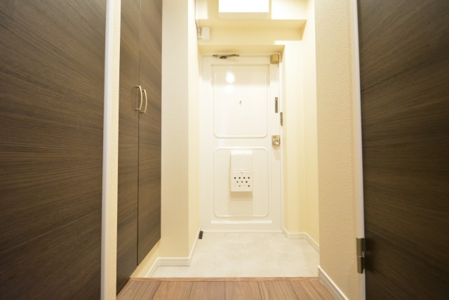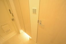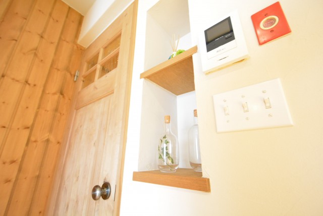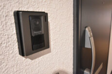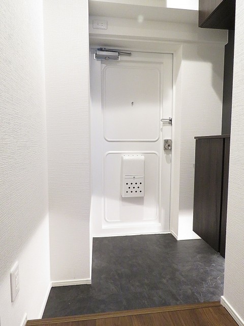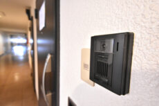 玄関ドア横にはモニター付きインターホンが付けられ、室内から玄関前の様子を確認することが可能です。料理などで手が離せない時にはとても便利ですよね。玄関ドアは勝手にリフォームが出来ないのですが、タイミングよく共有部工事で交換したばかりということでとても綺麗ですよ。さらに嬉しいダブルロック!