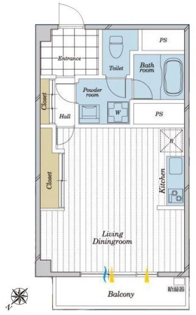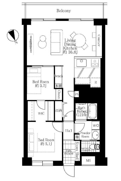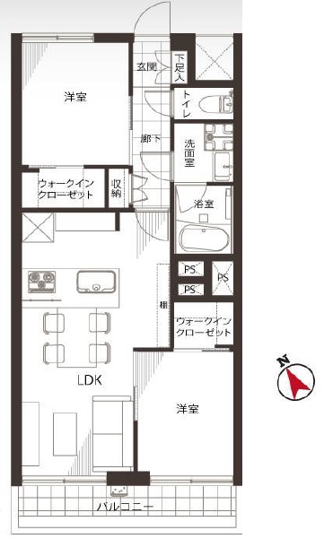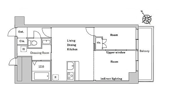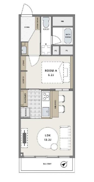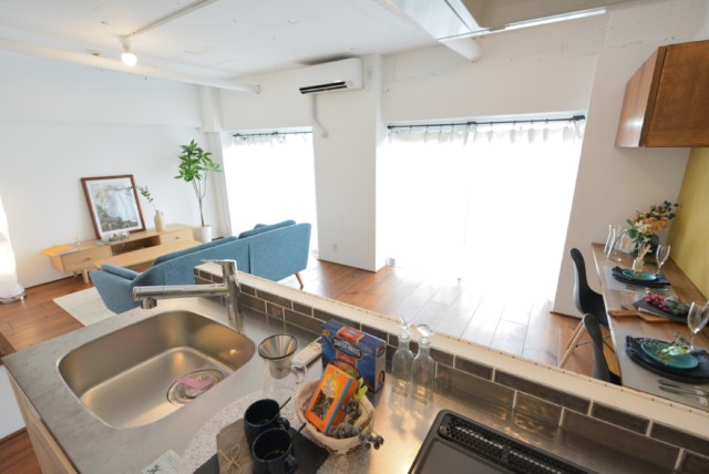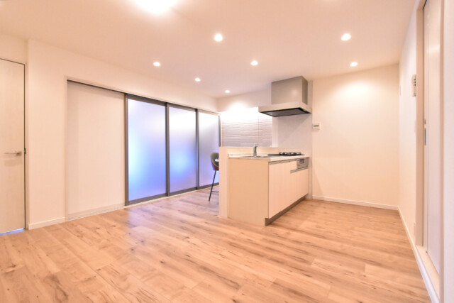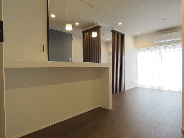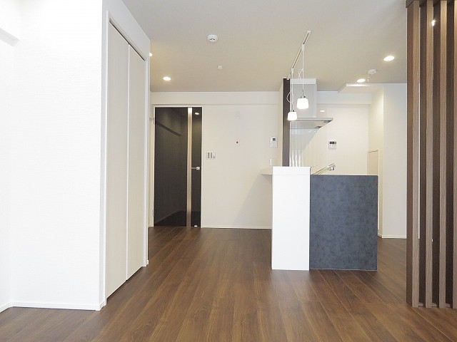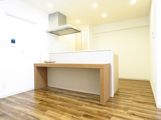 よくある縦長のお部屋を三等分してLDKと並べるタイプではなく、半分をDKに残り全部をLで使う感じなのでリビングはゆったりめ。キッチンに付設されたカウンターをダイニング代わりにすればさらに広々と使えそうですね。もちろん、食事をゆったりとしたい方は普通にダイニングテーブルを置くことも可能です。