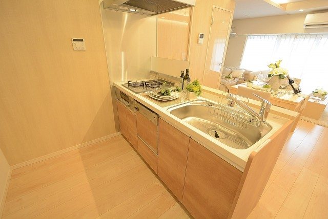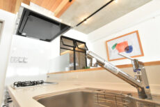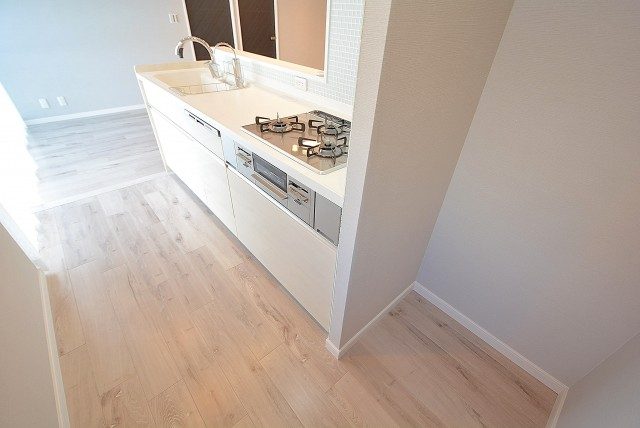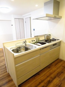 キッチンもフローリングに馴染む木目柄。浄水機能付き水栓、3口ガスコンロ、食洗機、と設備も充実しています。