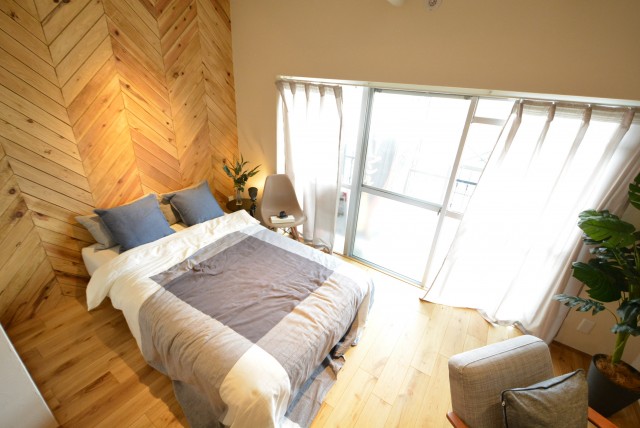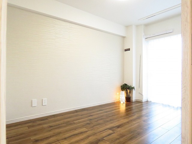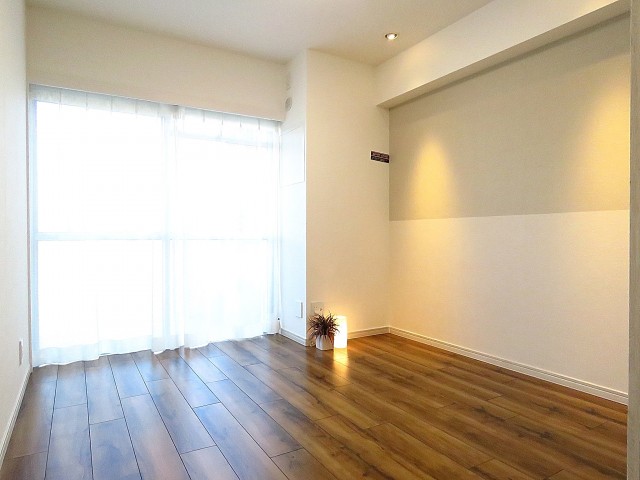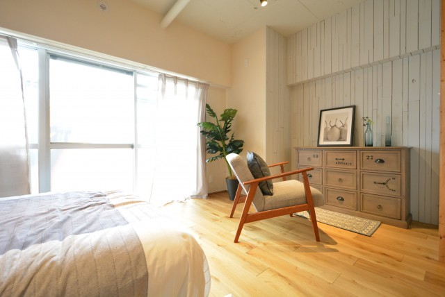 南東向きバルコニーに面した明るいお部屋です。ベッドルームはもちろん、日中在宅されることが多い方ならご覧のようにリビングとして使うのも良さそうですね。