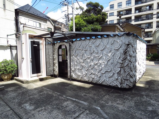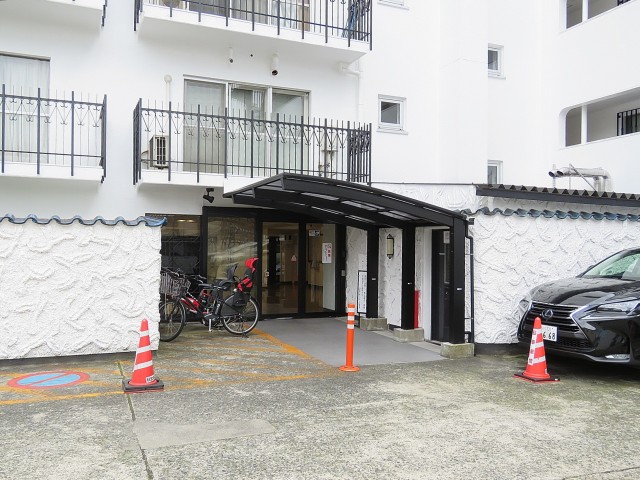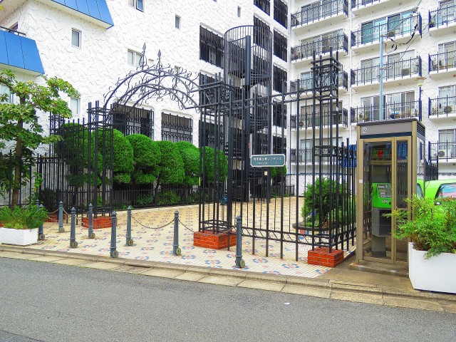 エントランスは2箇所あります。こちらのアーチがある方がメインエントランスになります。横に公衆電話がありますね。