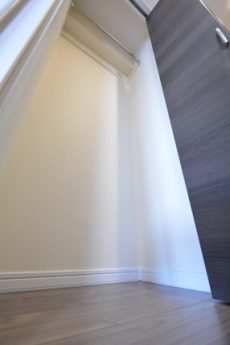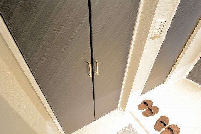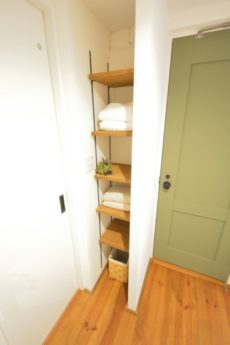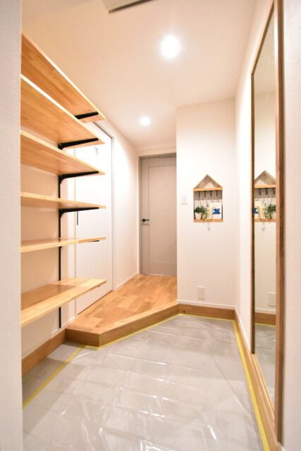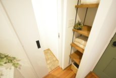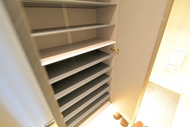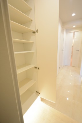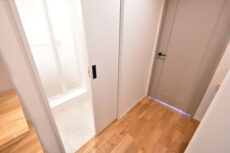 玄関横にはシューズBOXが設置されています。廊下側に大型収納があるので普段履く靴をこちらへ入れて、入りきらない靴を廊下側の収納で管理するのがよさそうです。